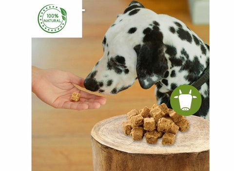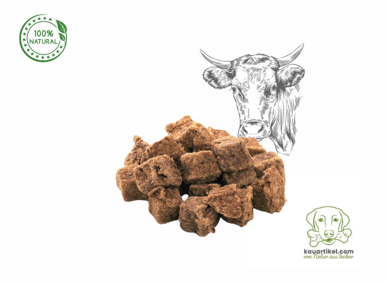 Nos cubes de boeuf naturels pour chiens sont composés à 100 % de boeuf et sont pressés en petits cubes ou découpés dans la viande sans additifs, puis séchés doucement. Elles sont donc idéales comme friandises entre les repas.