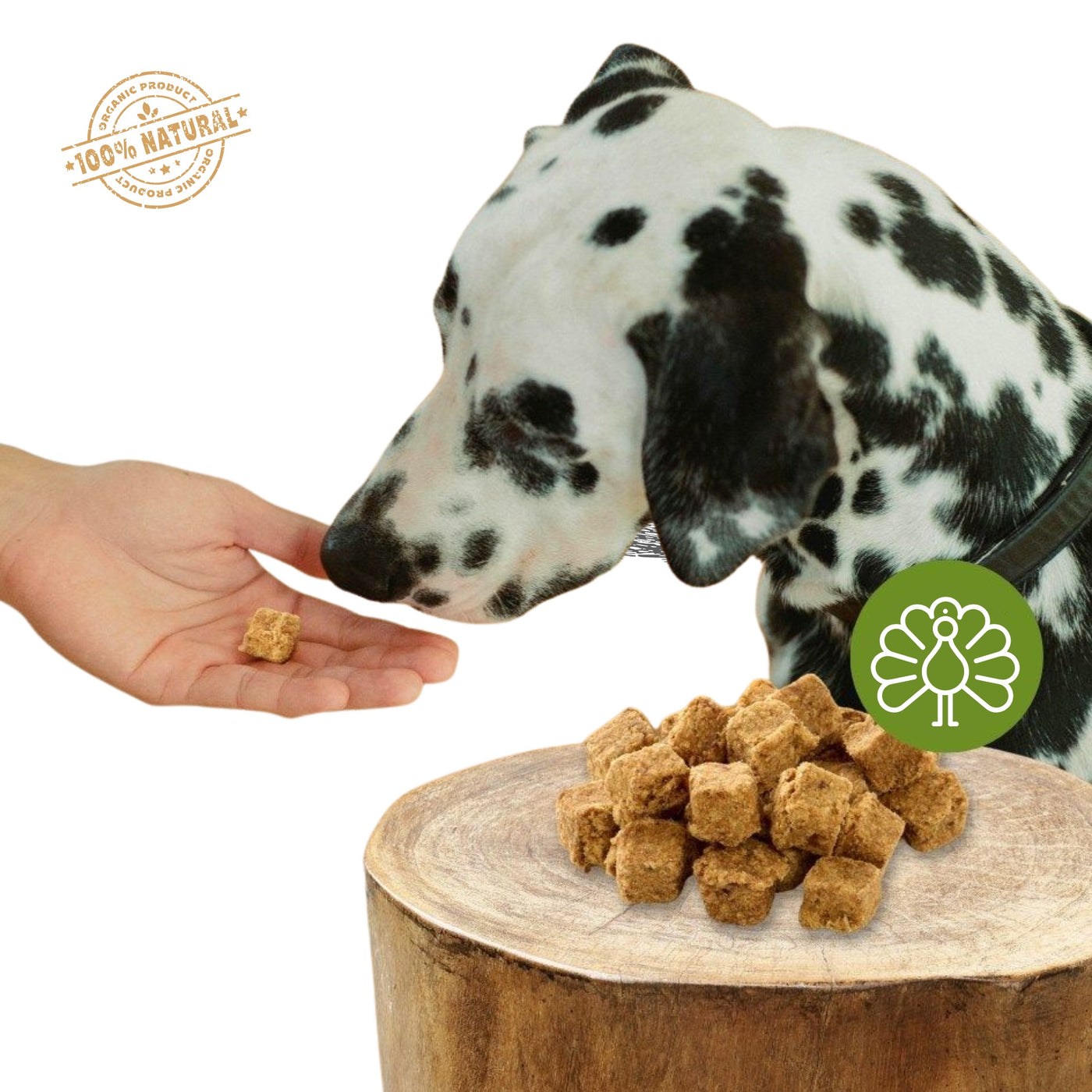 Nos cubes de dinde naturels pour chiens sont composés à 100 % de dinde et sont pressés en petits cubes ou découpés dans la viande sans additifs, puis séchés doucement. Elles sont donc idéales comme friandises entre les repas.