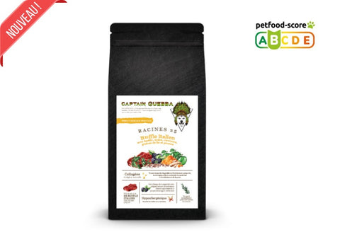 Les croquettes "Racines 25" de la marque Captain Guetta sont un aliment complet et équilibré à base de viande crue de haute qualité fraîchement préparée et cuite délicatement pour préserver la qualité des protéines, avec l’ajout d’un mélange de 5 Super aliments apportant des bénéfices nutritionnels.