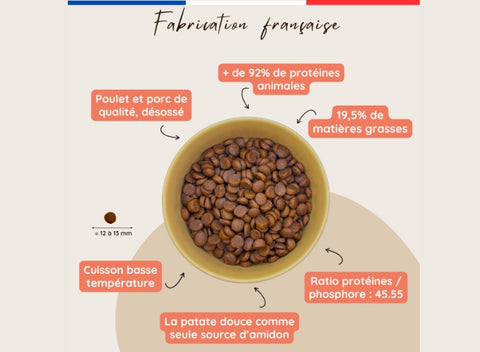Fabrication française : Recette de croquettes PREMIUM pour chien actif et/ou chiot sans céréales et sans légumineuses